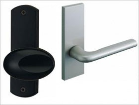 和室と廊下を仕切るドア用のレバーハンドルセットです。ハンドルセットは和室側が黒色塗装で、洋側(廊下)は表面をシルバー色の塗装で仕上げ(艶はありません)しています。