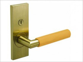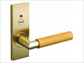 ドアのレバーハンドルです。グリップは木質でドア表面に合った色を選べます。他の金属部の表面はゴールド色でヘアライン処理(毛の様に細い線)しています。