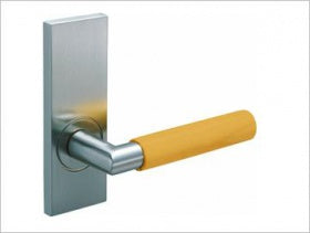 ドアのレバーハンドルです。グリップは木質でドア表面に合った色を選べます。他の金属部の表面はヘアライン処理(毛の様に細い線)しています。
