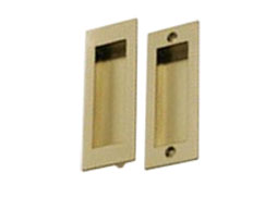 引き戸の取っ手です。表面はゴールド色でヘアライン処理(毛の様に細い線)しています。 扉への固定方法は、扉の引き手取り付け穴に斜めにビス締め固定です。こちらの商品は廃盤で在庫切れです。