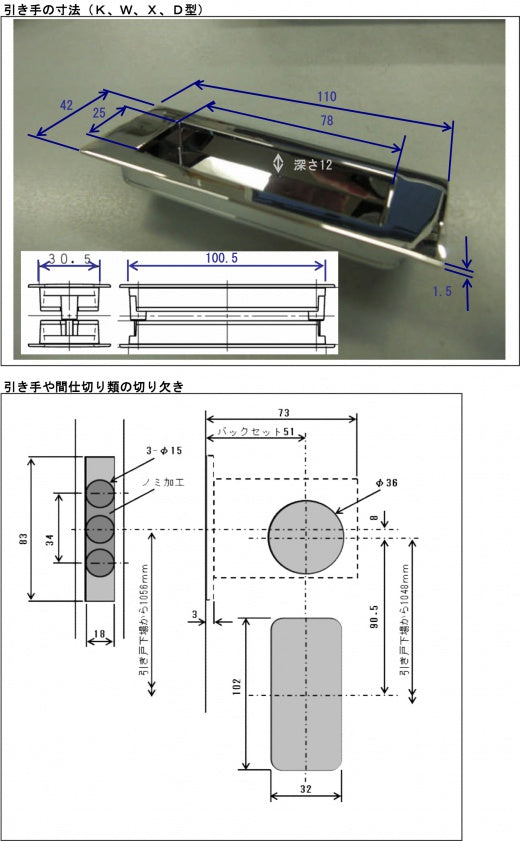 引き戸の取っ手です。表面はゴールド色でヘアライン処理(毛の様に細い線)しています。 扉への固定方法は、扉の引き手取り付け穴に斜めにビス締め固定です。こちらの商品は廃盤で在庫切れです。