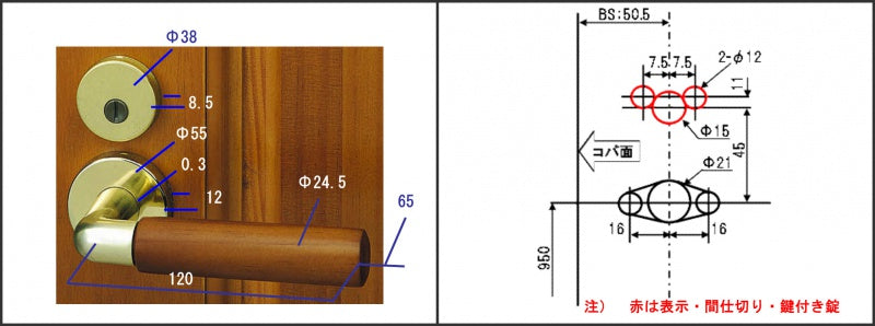 旧丸座鍵付きの場合は、錠ケースがセンターラッチであることを確認し、錠ケースをZY0835に変更後、交換が可能です。