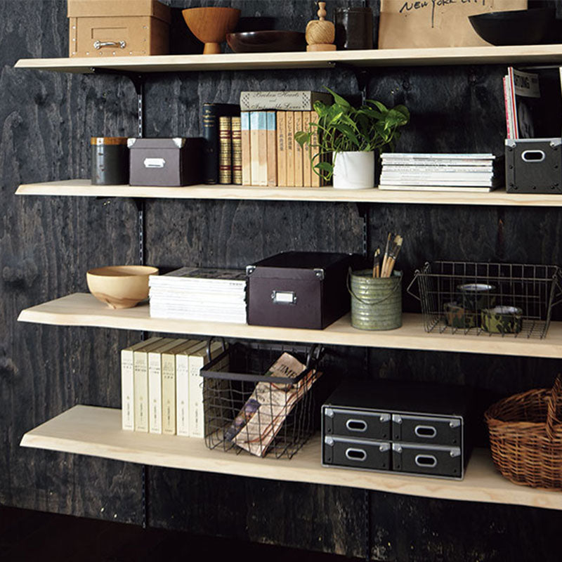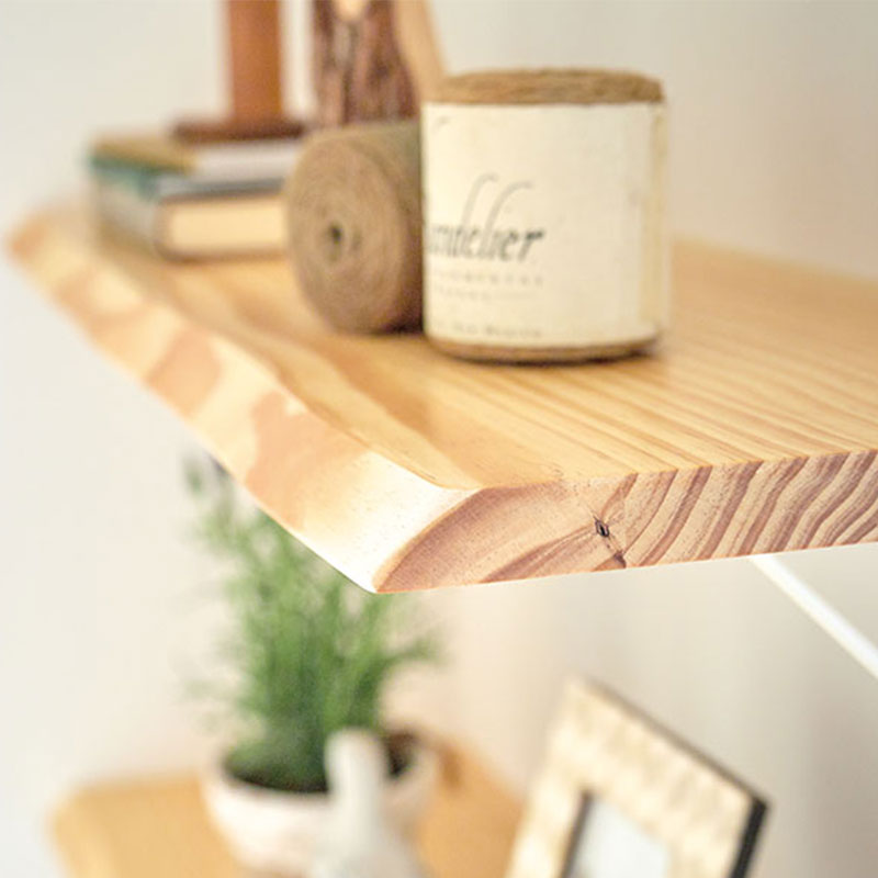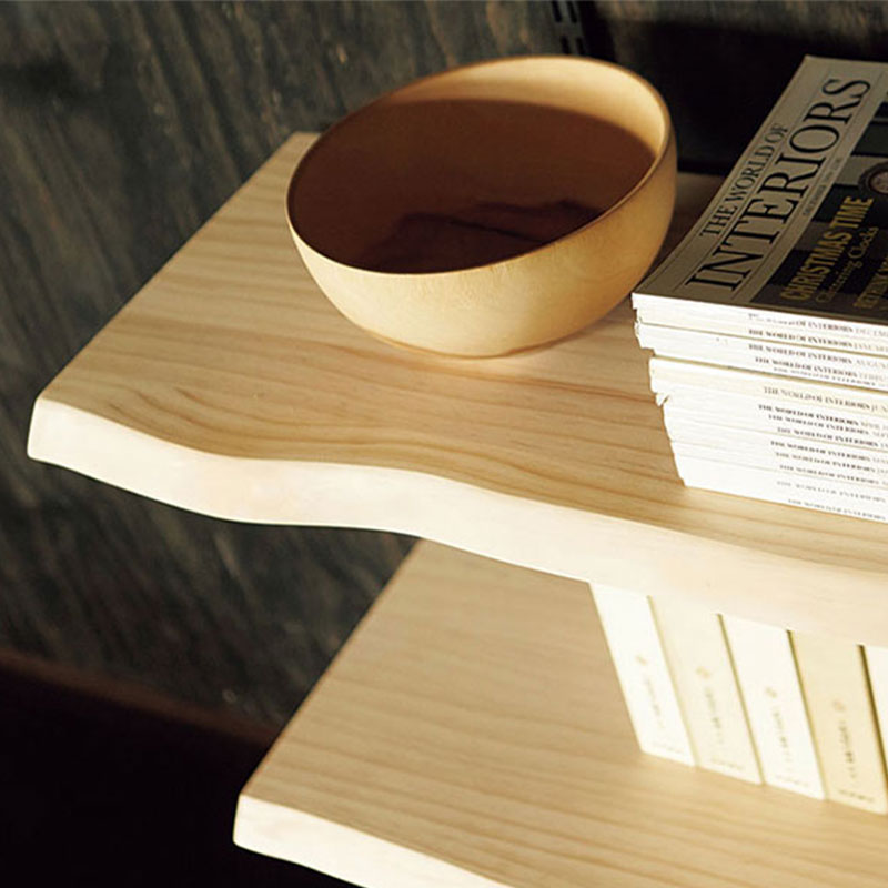 木の自然なラインを生かした、ミミ付きの棚板です。